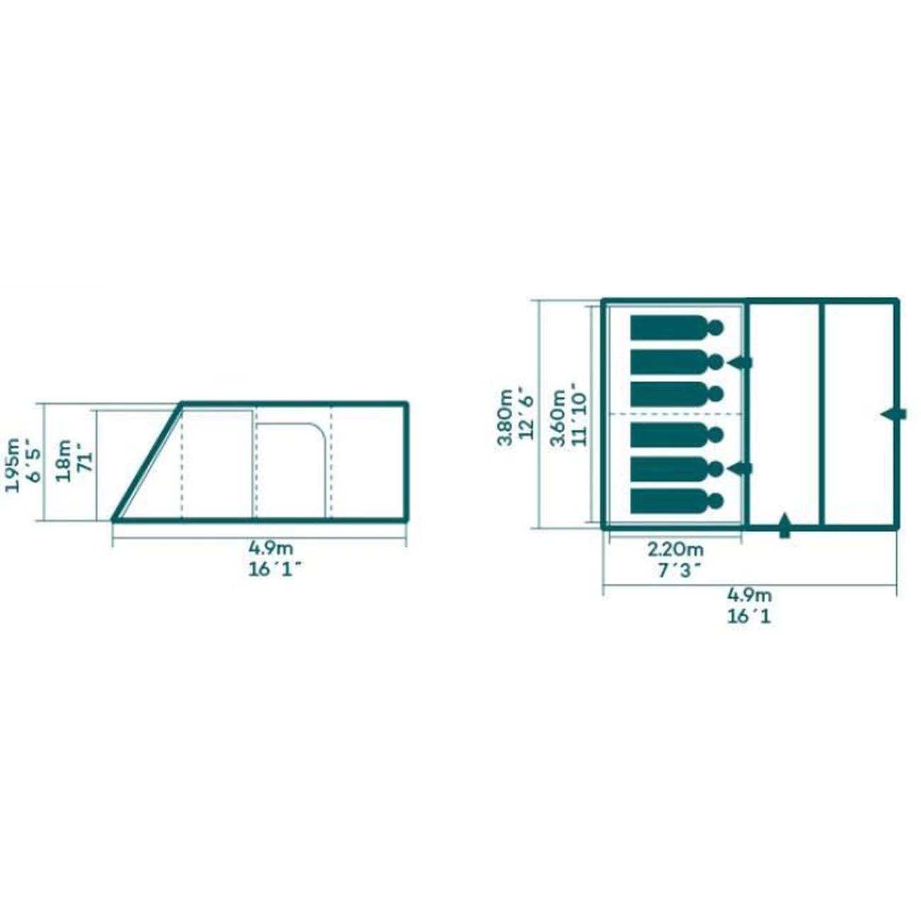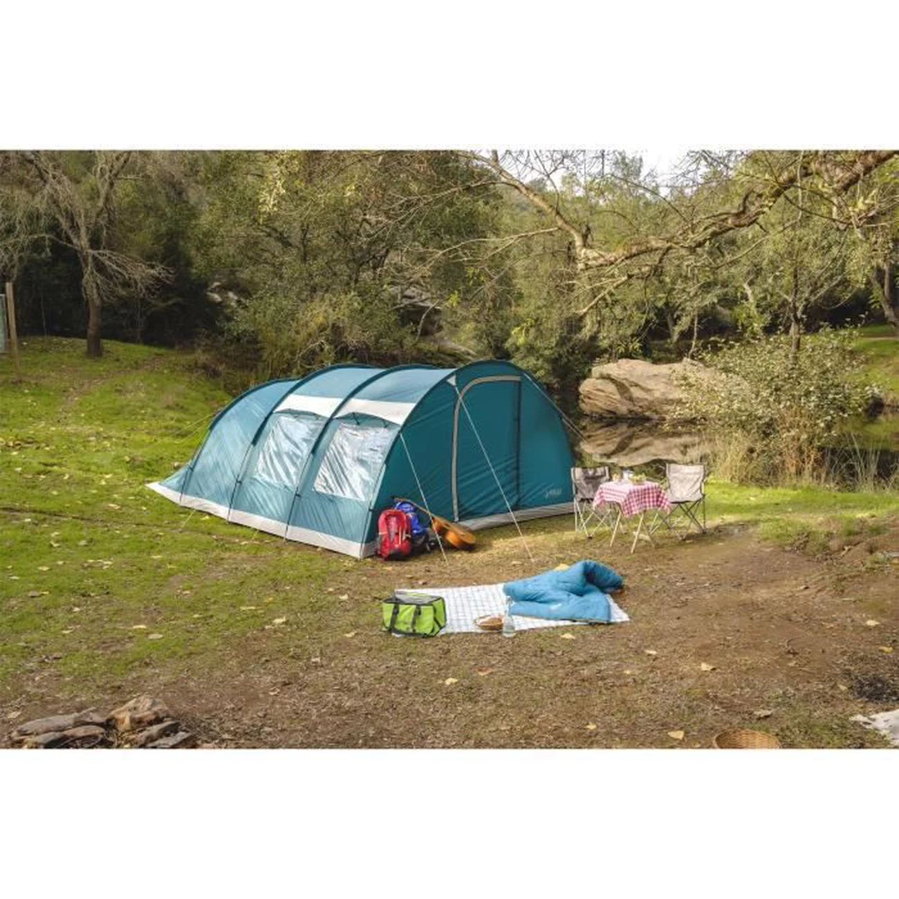 Extérieure : polyester 190T enduit de PU 3000 mm – Intérieure : polyester 190 T respirant – 490 x 380 x 195 cm – 16,5 kg – 2 chambres + 1 salon – 2 portes et 3 fenetres avec moustiquaire – 6 poches de rangement intérieures – Haubans réfléchissants – Armatures en fibre de verre – Sac de transport – 32 piquets