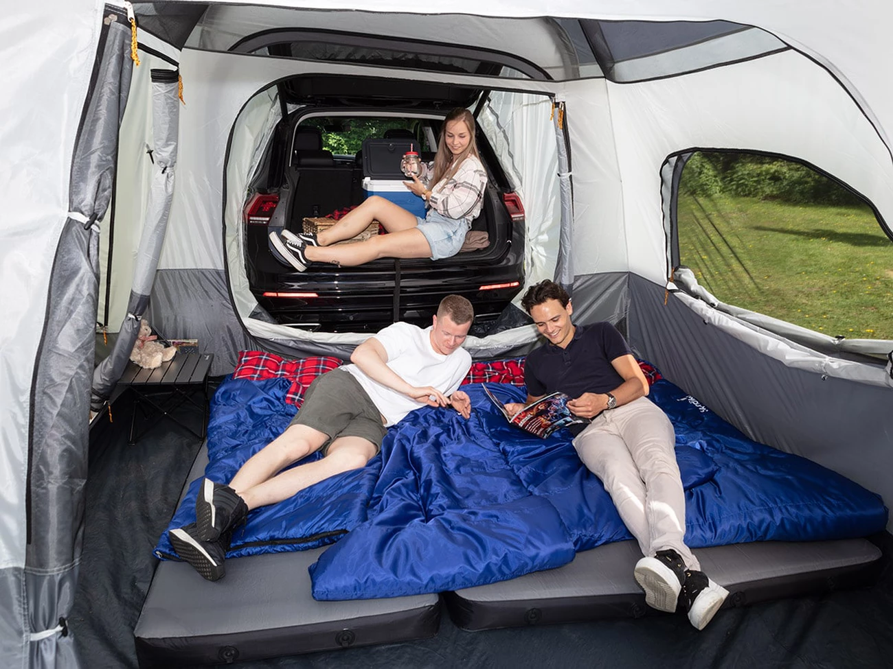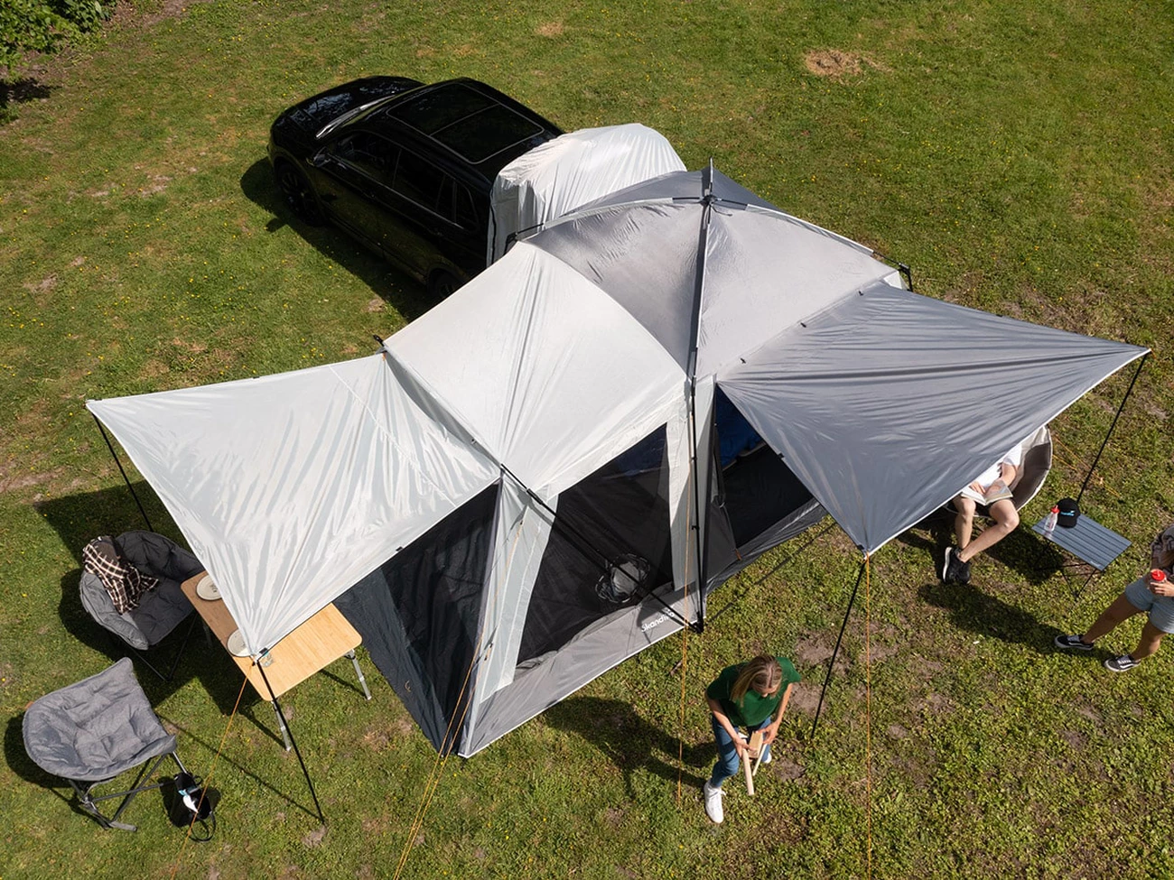 L’entrée principale ainsi que la seconde entrée par la cabine, en face de la serrure de la voiture, offrent une grande flexibilité en termes de lumière et d’air. Grâce aux quatre piquets de relevé inclus, les deux entrées se transforment en une marquise pratique lorsqu’on a besoin d’ombre, mais peuvent être fermées lorsque le temps n’est pas aussi clément.