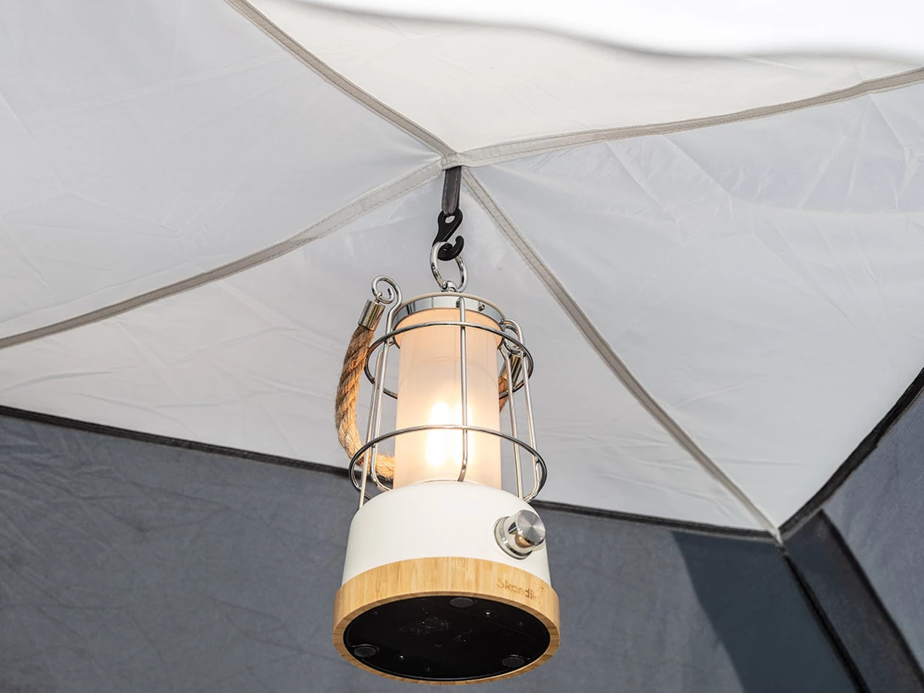 La zone en forme de dôme de la tente présente une hauteur debout exceptionnelle de 230 cm, ce qui contribue à un climat intérieur agréable dans la cabine de luxe spacieuse pour quatre personnes. L’auvent sert d’espace de détente et semble confortable et aéré avec ses grandes fenêtres.