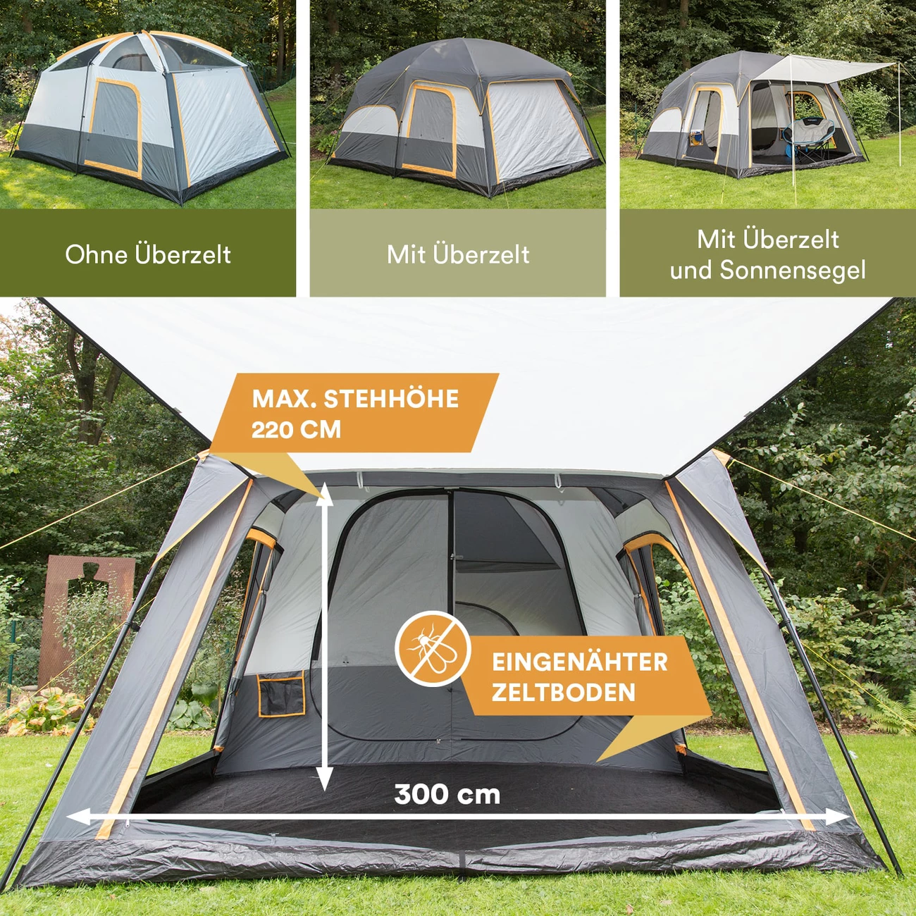Une tente comme Tønsberg, du nom la plus ancienne ville de Norvège, on ne la voit vraiment pas tous les jours. Très inhabituel: le double toit n’est pas cousu à la tente principale et est donc amovible. Cette caractéristique rend la tente Tønsberg idéale pour le printemps et l’été, une excellente ventilation est garantie! Lors de pleine chaleur vous pouvez simplement enlever le double toit. De plus, plusieurs entrées dans le séjour et une grande fenêtre dans la cabine, pouvant être divisée en deux grâce à la cloison amovible, permettent de laissent passer l’air et la lumière. Les fenêtres et entrées se ferment par fermeture éclair. Ce qui est formidable c’est la grande porte frontale qui peut être transformée en marquise offrant ainsi en plus d’espace. En parlant de l’espace – là il y a beaucoup pour 5 personnes. Et personne ne devrait se cogner la tête, car la hauteur de plafond varie à l’intérieur de 1m70 jusqu’à un 2m20! Bien connu de chez skandika la tente a beaucoup d’extras tels qu’un crochet de fixation pour la lampe, des poches organisatrices et des moustiquaires sur toutes les fenêtres et les portes. Le tapis de sol cousu, le double toit avec sa colonne d’eau de 4000 mm et les coutures étanches scellées vous protégeront de l’humidité. La tente Tønsberg – une tente extraordinaire deux saisons pour toute la famille!