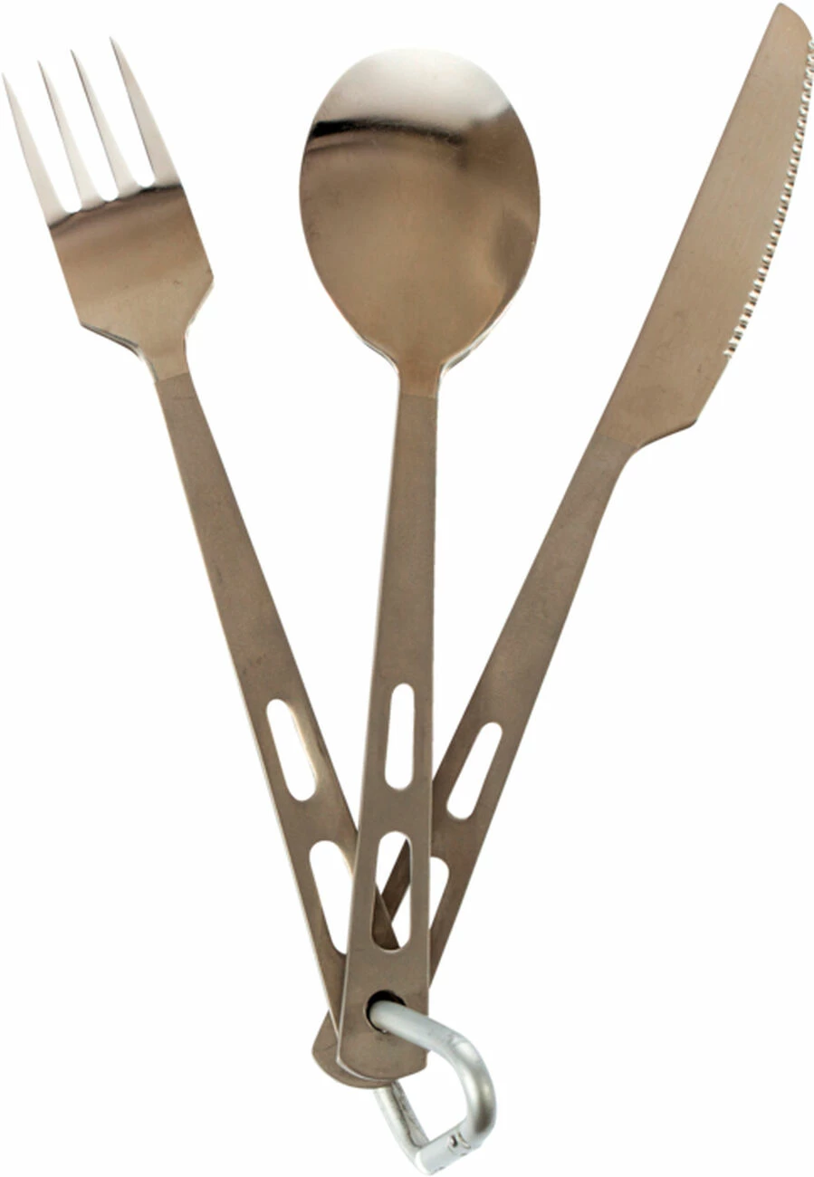 Le kit couverts comprend 3 pièces: 1 fourchette de 16 cm, 1 couteau de 16 cm et une cuillère de 15.6 cm en inox. Ils sont livrés avec un mousqueton qui permet de les ranger ensemble sans en perdre très pratique lors d’un déplacement.