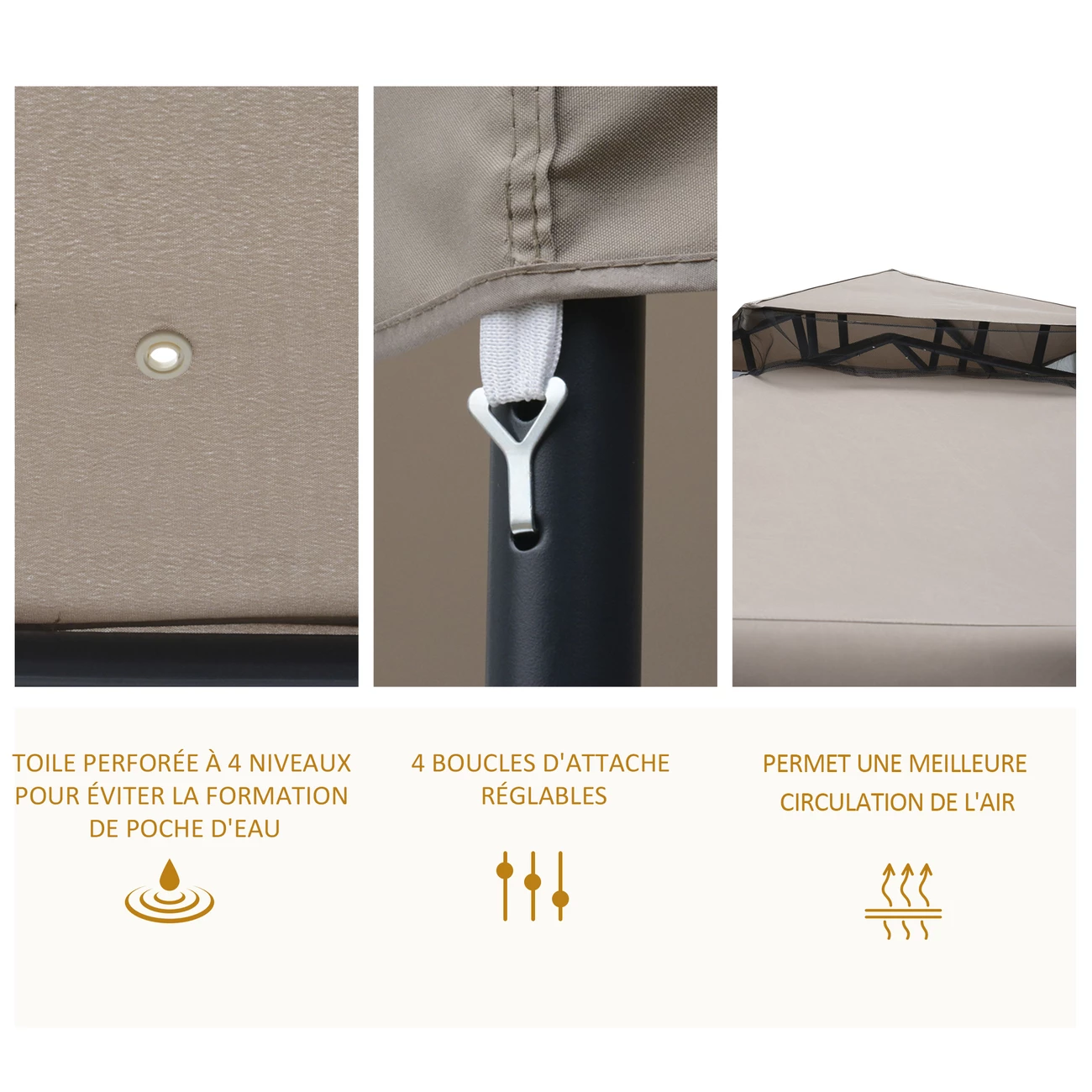 – Toile principale de toit perforée à 4 niveaux pour éviter toute formation de poche d’eau