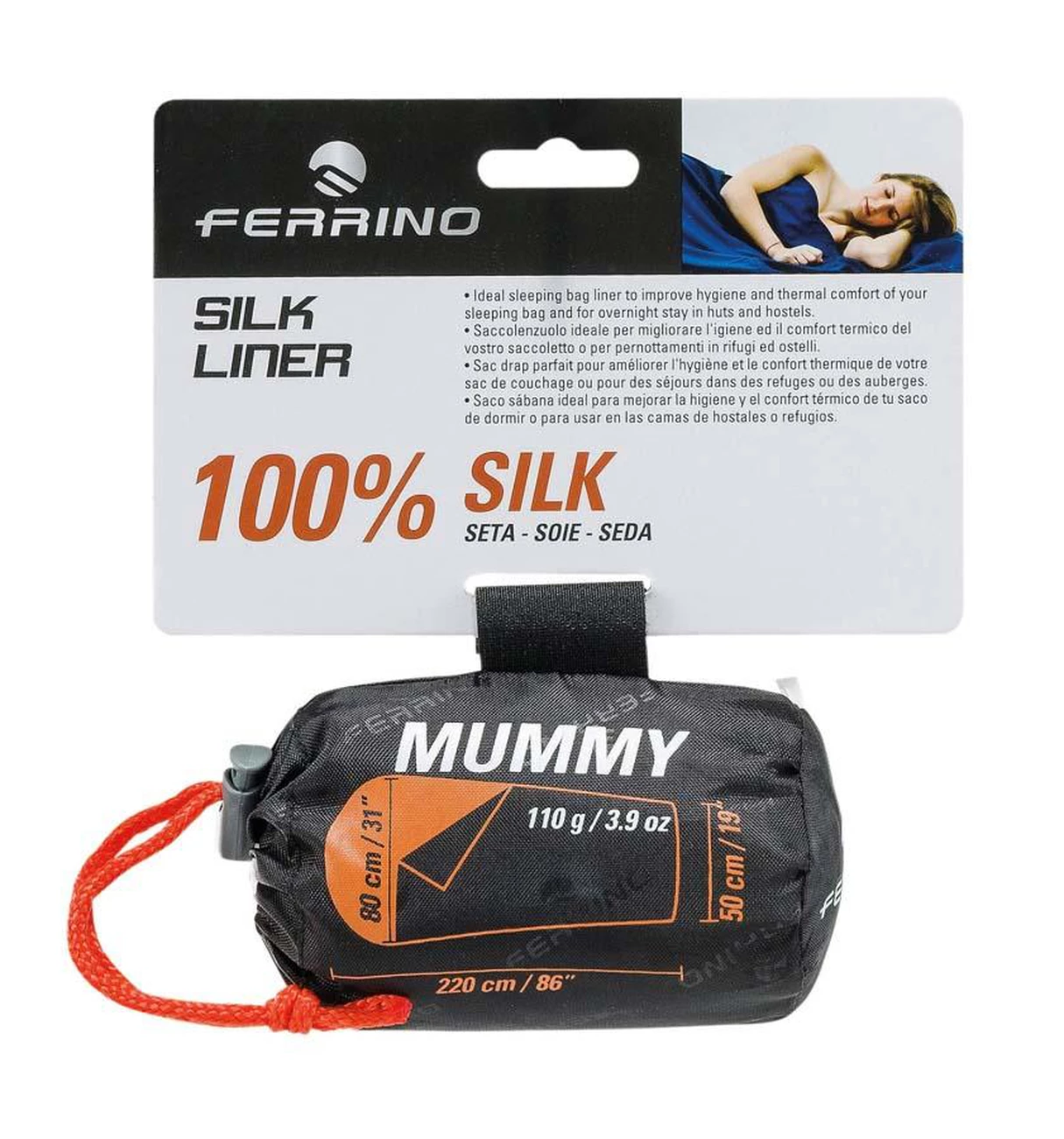 Sacs de couchage accessoires ferrino silk mummy. Sac drap parfait pour améliorer lhygiène et le confort thermique de votre sac de couchage ou pour des séjours dans des refuges ou des auberges de jeunesse.specifications:- poids: 110 g- dimensions: 220 x 80 x 50 cm / 7 x 13